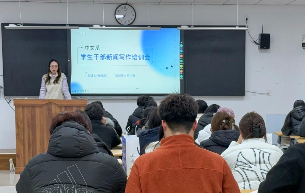 为提升中文系学生干部队伍新闻写作能力,增强系部新闻宣传成效,11月17日,中文系学生干部新闻写作培训会在知行楼B214教室顺利举办,主讲人为专职辅导员张瑞杰。
